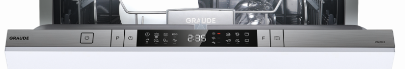 Подсветка внутреннего пространства позволяет улучшить обзор внутреннего пространства моечной камеры. Безопасной работе служит система защиты от протечек. Высокий класс энергоэффективности A+++ гарантирует экономичный расход электроэнергии. Внутреннее оснащение представлено двумя вместительными корзинами и выдвижной полкой для столовых приборов, которая располагается сверху. Посудомоечную машину Грауде VG 60.2 S отличает тихая работа, поэтому начало цикла можно запрограммировать на ночное время при помощи таймера. Специальная индикация позволяет с комфортом следить за наличием соли и ополаскивателя.