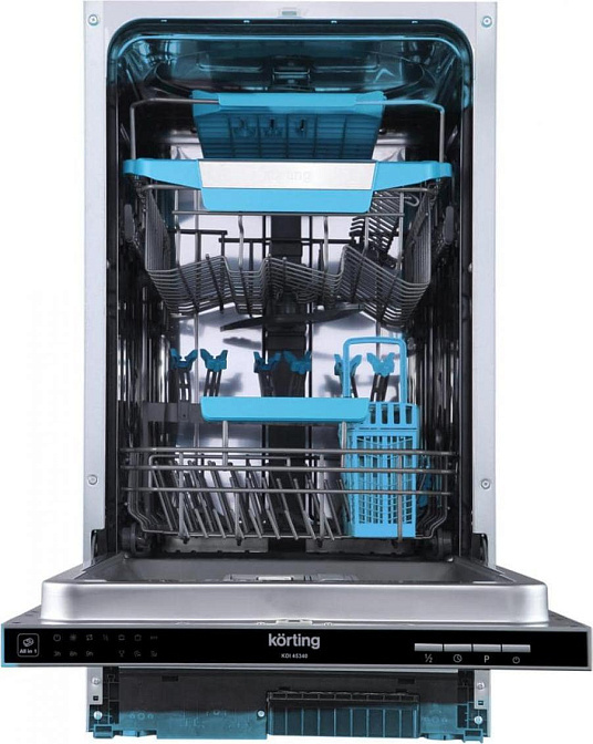 Панель управления посудомоечной машины Кертинг KDI 45340 организована кнопками. Запустить начало работы можно с отсрочкой старта до 9 часов. Анализатор автоматически оценивает жёсткость воды для установки оптимальных параметров. Функция половинной загрузки тратит столько воды, электроэнергии и моющего средства, сколько необходимо для очистки половины посуды, экономя ваш бюджет. Уровень шума не более 55 дБ обеспечит комфортную эксплуатацию даже в ночное время. А система полной защиты от протечек обезопасит от последствий случайной неисправности. На устройство распространяется гарантия производителя в течение 24 месяцев.