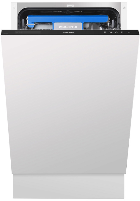 Внутри имеется две большие корзины для посуды и выдвижная полка для столовых приборов. Большое количество разнообразных держателей позволяет с комфортом разместить предметы. Луч на полу помогает контролировать работу посудомоечной машины Манфелд MLP-08IMR. Управление располагается с внутренней стороны двери. Сенсорные кнопки быстро реагируют на нажатия.