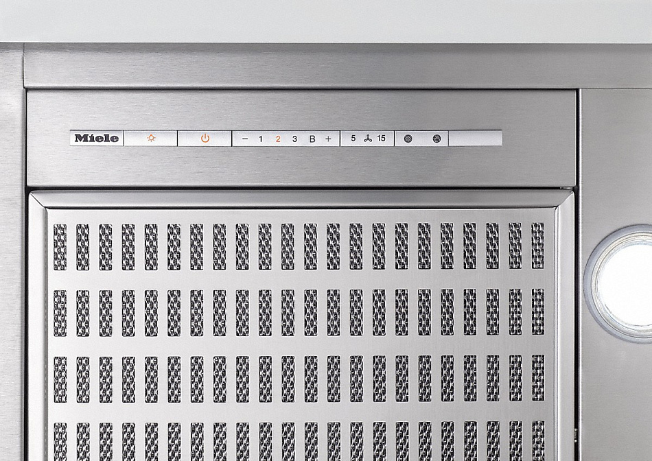 Эффектная встраиваемая вытяжка из нержавеющей стали от Miele. Монтаж прибора производится в подвесной шкаф, что позволяет максимально эргономично разместить на кухне мебель и бытовую технику. Светодиодная подсветка обеспечивает яркое освещение рабочей зоны.