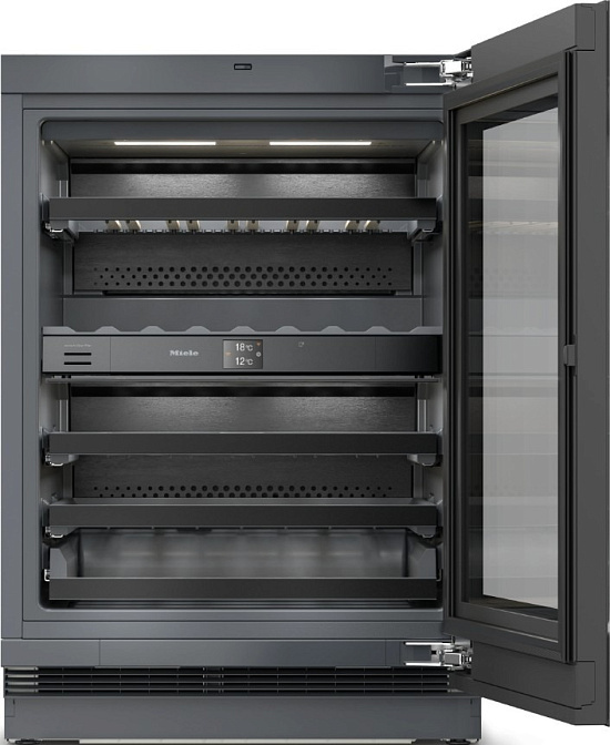 Винный холодильник Miele KWTUS 7196 E имеет две температурные зоны, в которых одновременно можно хранить разные сорта алкоголя и выставлять разные сочетания настроек. Он встраивается в нишу, что удобно, если у вас ограничен метраж помещения. Благодаря компактным размерам данная модель — отличный выбор для офиса, гостиничного номера. Количество бутылок, которое можно разместить с учетом полной комплектации и из расчета объема бутылки 0,75 л, — 38 шт.