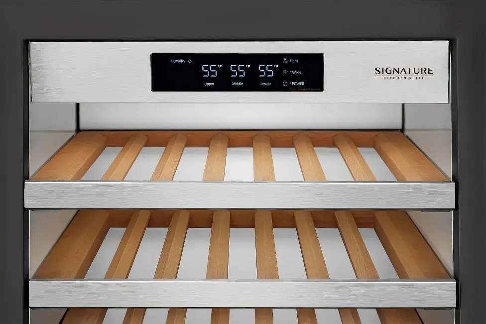 Встраиваемый винный шкаф Signature SKSCW242RP — практичное решение для хранения благородных напитков в оптимальных условиях. Этот прибор характеризуется высотой 214.6 см и способен одновременно вместить до 113 бутылок объемом 0.75 л. Для размещения бутылок предусмотрены полки, материал изготовления которых — натуральное дерево. Количество полок — 10. Тип охлаждения данного шкафа — инверторный компрессор. Удобный электронный дисплей помогает проконтролировать рабочие параметры. Низкий уровень шума, равный 37 дБ, служит комфортной эксплуатации устройства. Дверцу можно перенавесить, изменив тем самым сторону ее открывания.