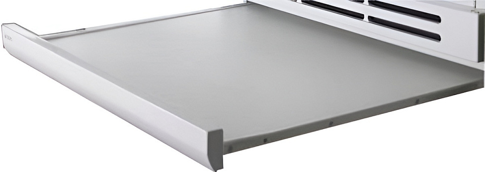 Выдвижная полка устанавливается между стиральной и сушильной машиной или же отдельно с моделью того или иного вида. Она значительно облегчает весь процесс, когда необходимо разделять белье по типам тканей для более эффективной стирки. Выдвижная полка прекрасно подходит для экономии свободного пространства в небольших помещениях.