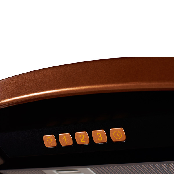 Вытяжка Куперсберг BONA 60 B Bronze работает как в режиме отвода, так и рециркуляции для различных типов подключения и технической возможности помещения. Интенсивность втягивания воздуха можно отрегулировать на 3 ступенях. Таймер расширяет функционал модели, он автоматически выключит прибор, без необходимости контроля. Среди полезных функций прибора есть подсветка, она реализована двумя лампами мощностью 4 Вт для каждой. LED-технология освещения обеспечивает яркую подсветку рабочей зоны в кухне, при этом снижает затраты на электропотребление. Благодаря наличию функции шумоподавления, негативные эмоции снижаются до минимума, уровень шума 42 дБ.