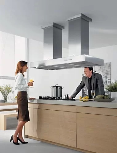 Отдавая предпочтение современному стилю, стоит остановить свой выбор на вытяжке Miele DA 5330 D. Островная каминная вытяжка монтируется к потолку. Работает только в режиме отвода воздуха. За чистоту воздуха отвечают шесть жировых фильтров со счетчиком времени работы, сообщающим о насыщении при помощи индикатора.